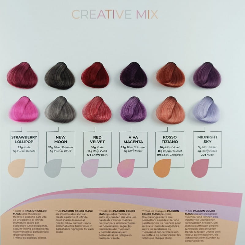 Wszystkie maski PASSION COLOR MASK można ze sobą mieszać, tworząc paletę nieskończonych odcieni kolorystycznych, umożliwiającą eksperymentowanie z nowymi kolorami i pozostawanie w zgodzie z aktualnymi trendami.