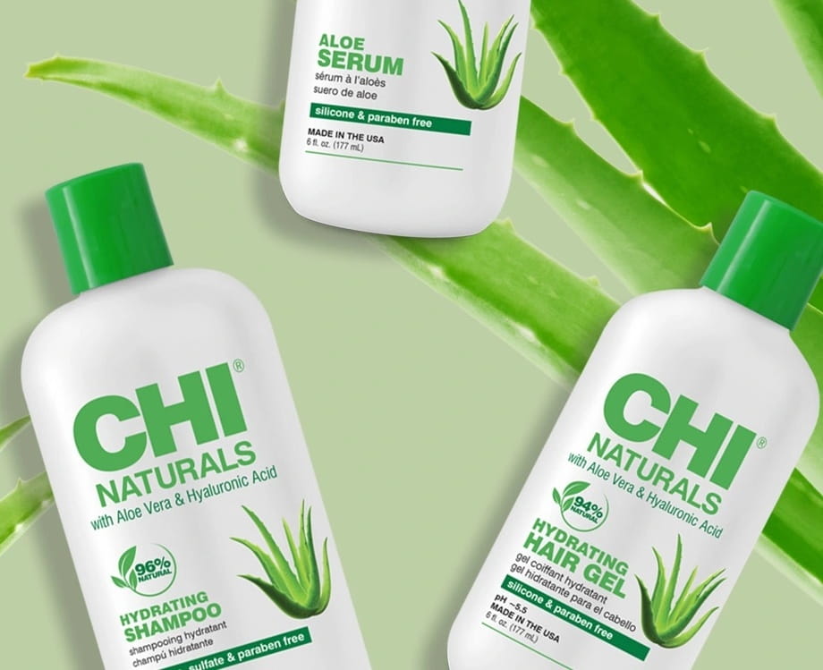 - Seria kosmetyków CHI Naturals with Aloe Vera and Hyaluronic Acid przywraca równowagę wodną we włosach oraz nawilża skórę głowy, zapewniając optymalne nawilżenie.