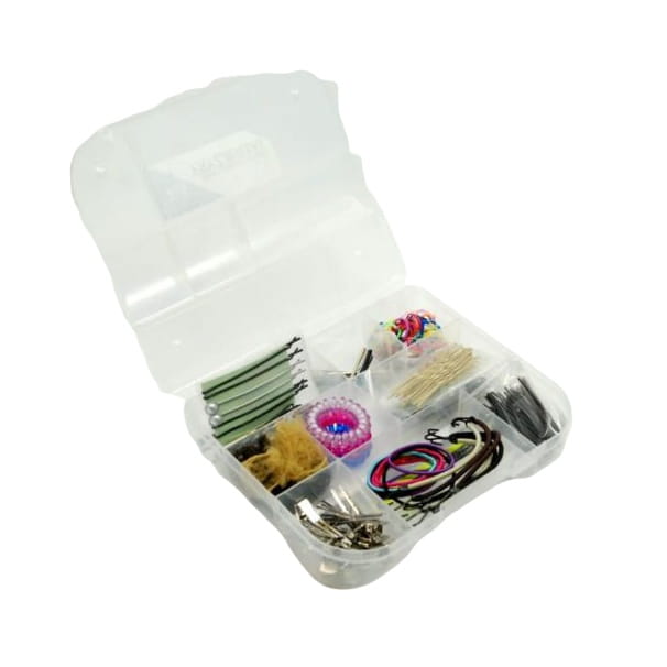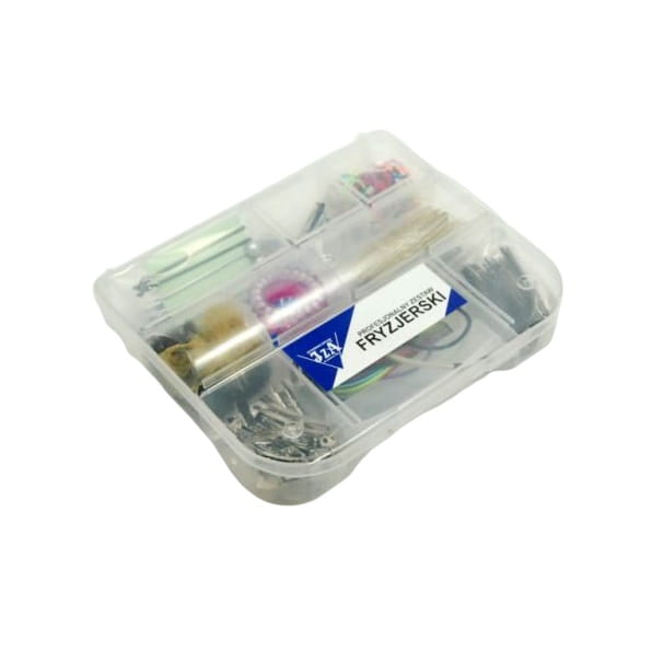 - Bardzo praktyczny i poręczny zestaw fryzjerski w walizce w którym są : różnego rodzaju gumki, spinki, szpilki - kokówki, klipsy, siatki do koków.