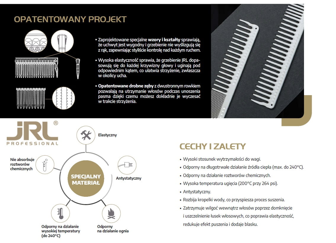 Grzebienie do włosów JRL charakteryzują się niezwykłą elastycznością oraz odpornością na działanie wysokiej temperatury. Opatentowane drobne zęby umożliwiają dokładne wyczesywanie pasm w trakcie strzyżenia. Dzięki szerokiej ofercie zawsze dobierzesz odpowiedni grzebień do swoich potrzeb. Materiał z którego zostały wykonane nasze grzebienie posiada wysokie właściwości antystatyczne co pozwala zapobiec elektryzowaniu włosów.
