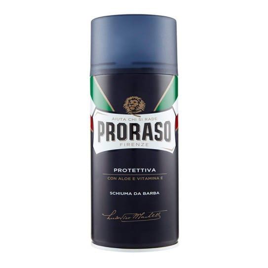 - Proraso Blue pianka do golenia z witaminą Е, aloesem i ekstraktem z lukrecji do każdej cery, w tym też suchej i wrażliwej.