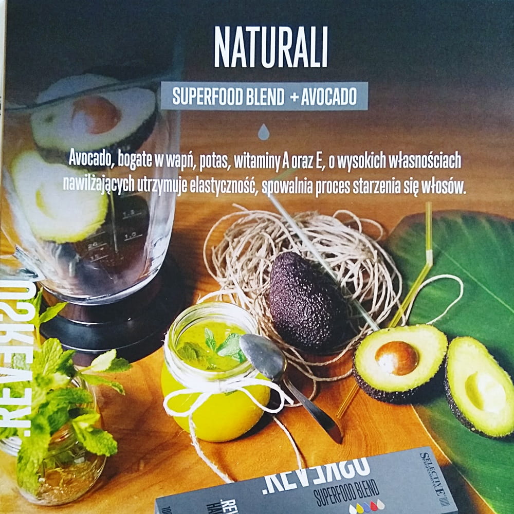 - NATURALI – SUPERFOOD BLEND + AVOCADO – awokado jest bogate w wapń, potas, witaminy A oraz E, o wysokich właściwościach nawilżających utrzymuje elastyczność, spowalnia procesy starzenia się włosów.