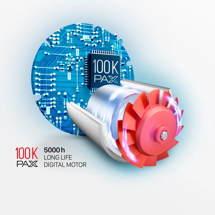 Jej wytrzymały cyfrowy silnik 100K-PAX podnosi parametry wydajności na nowy poziom, a to dzięki prędkości 100 000 obr./min i żywotności aż do 5000 godzin osiąga wysokie ciśnienie powietrza i natężenie przepływu powietrza 80 m3/h.