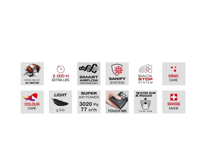 Posiada BACK STOP SYSTEM : konstrukcja silnika z systemem BACK STOP zwiększa bezpieczeństwo i trwałość konstrukcji suszarki. W trakcie suszenia włosów, zabrudzenia, pył, lakier do włosów jak również same włosy mogą przedostawać się do wnętrza urządzenia i utrudniać pracę silnika czy też elementu grzejnego. System BACK STOP zatrzymuje znaczną część zabrudzeń, które mogłyby zagrozić pracy suszarki. System BackStop jest wynikiem badań VALERA, zgłoszeń patentowych „Made in Switzerland”.