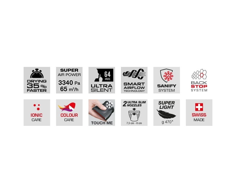 Posiada BACK STOP SYSTEM : konstrukcja silnika z systemem BACK STOP zwiększa bezpieczeństwo i trwałość konstrukcji suszarki. W trakcie suszenia włosów, zabrudzenia, pył, lakier do włosów jak również same włosy mogą przedostawać się do wnętrza urządzenia i utrudniać pracę silnika czy też elementu grzejnego. System BACK STOP zatrzymuje znaczną część zabrudzeń, które mogłyby zagrozić pracy suszarki. System BackStop jest wynikiem badań VALERA, zgłoszeń patentowych „Made in Switzerland”.